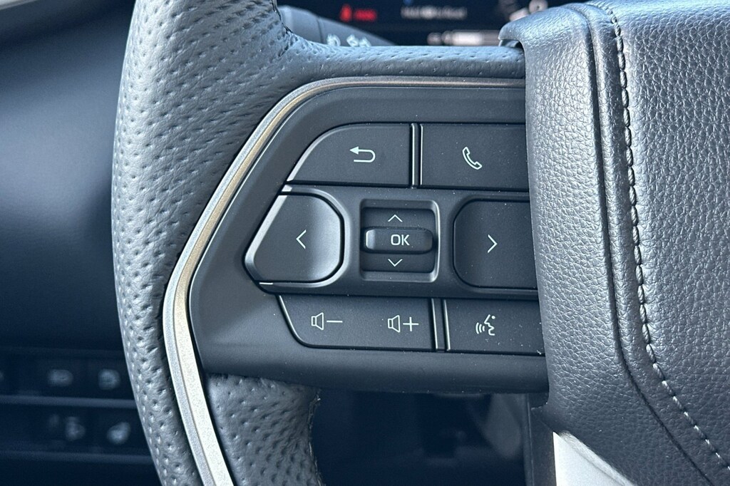 - Leather-wrapped manual tilt/telescopic steering wheel with phone, audio, display/infotainment, and Driver Assist controls