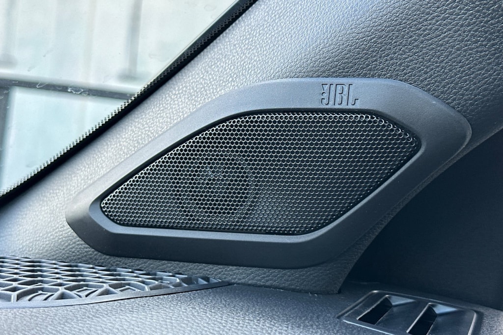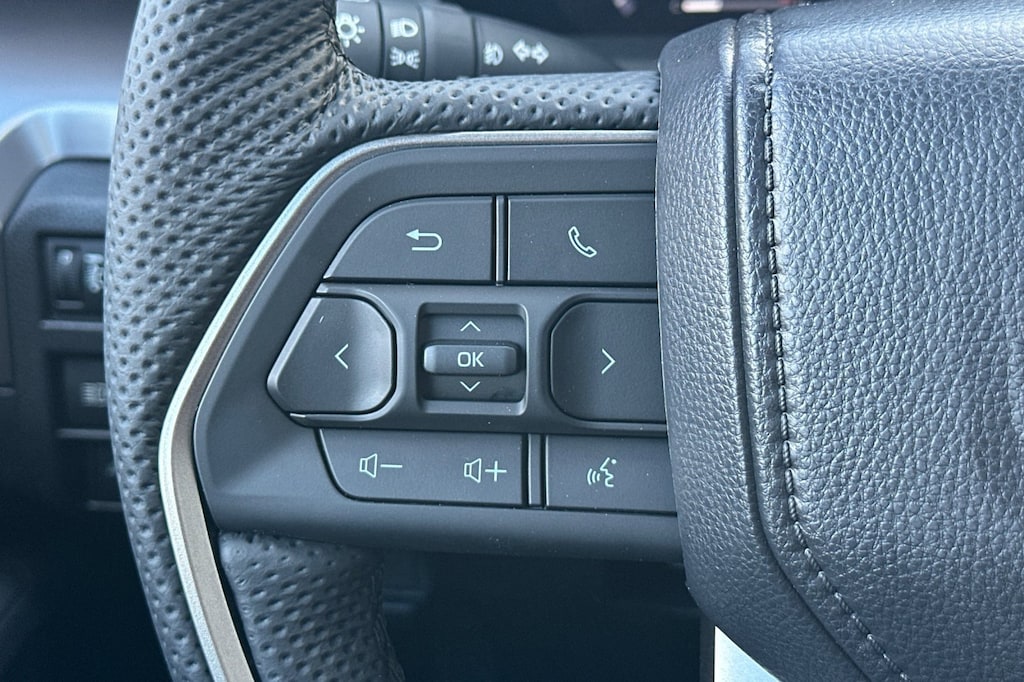 - Leather-trimmed manual tilt/telescopic steering wheel with phone, audio, display/infotainment, and driver assist controls.