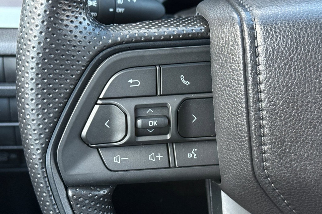 - Polyurethane manual tilt/telescopic steering wheel with phone, audio, display/infotainment, and driver assist controls.