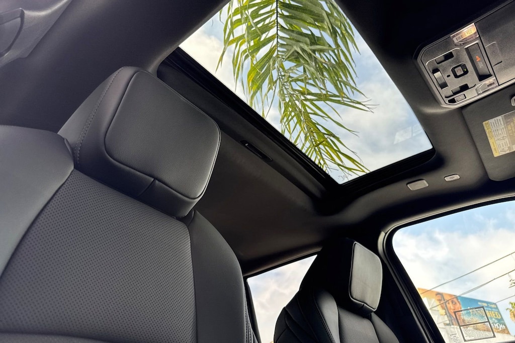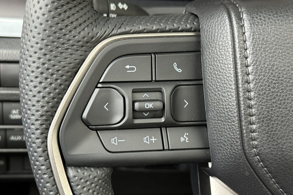 - Leather-trimmed manual tilt/telescopic steering wheel with phone, audio, display/infotainment, and driver assist controls.